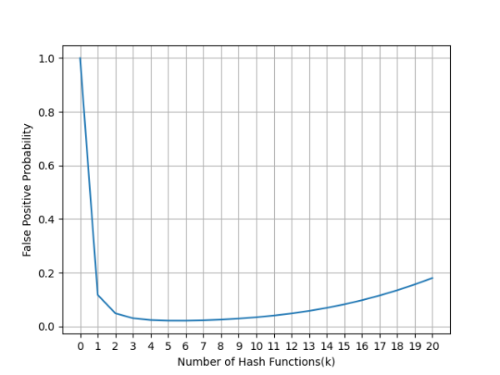 이 그래프를 통해 최적의 해시 함수의 개수를 파악할 수 있습니다. 위의 그래프를 미분했을 때 기울기가 0인 지점이 바로 최적의 개수입니다. 위 그래프인 경우 해시 함수를 4 ~ 6개 사용하는 것이 적절해 보입니다.