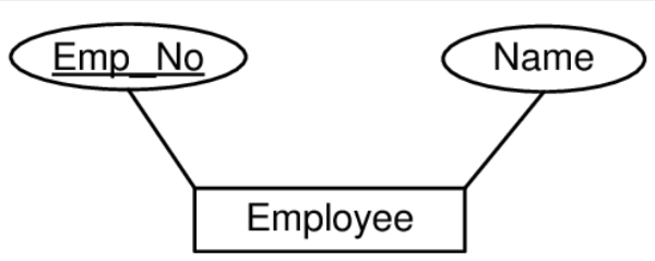 아래의 그림을 보면 'Employee'라는 개체에 'Emp_No'와 'Name' 2개의 속성이 있음을 알 수 있고, 'Emp_No' 속성에 밑줄을 그어서 key 속성임을 표시하고 있습니다.