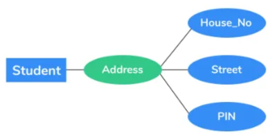 - 단순 / 복합: 아래의 '그림 2'를 보면 'Student' 개체에 'Address' 속성이 있고, 'Address'는 'House_No', 'Street', 'PIN' 속성을 가지고 있음을 확인할 수 있습니다. 즉, 'Address' 속성 하나가 3가지 속성을 복합적으로 포함하고 있습니다. 하지만 테이블로 저장할 때는 복합 속성을 사용하지 않고 복합 속성들을 각각 단순 속성으로 해서 저장합니다. 테이블에 저장할 때 'Address' 열을 저장하는 대신, 'House_No', 'Street', 'PIN' 3개의 열을 추가할 수 있을 것입니다.