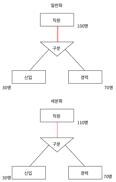 - 세분화(specialization): 상위 개체 타입에서 하위 개체 타입을 유도, 세분화를 일반화로 표현 가능