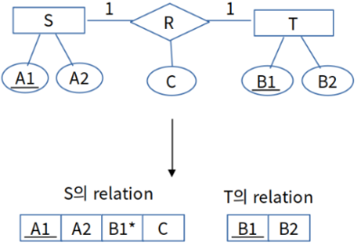 개체 S와 T는 관계 R에 대해 부분 참여 하고 있고, R은 1:1 관계 타입입니다. 위 그림의 경우, T의 키를 S의 외래 키로 추가했습니다.(외래 키 표시는 속성 이름 뒤에 * 표시를 붙였습니다.) 그리고 R의 속성 C도 S의 relation의 속성으로 추가했습니다.