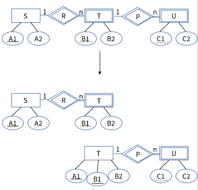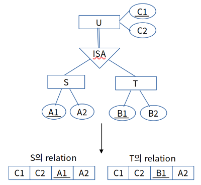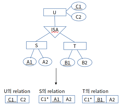 위와 같이 세분화를 나타내는 ERD에서 relation으로 바꾸는 경우 U의 relation도 같이 생성합니다. S와 T의 relation에는 U의 키가 외래 키로 추가됩니다.