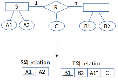 위 그림의 경우, 개체 T가 관계 R에 전체 참여하고 있으므로 S의 키 A1을 T의 relation의 외래 키로 추가했습니다.