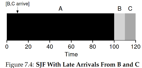 이때의 평균 turnaround time은 (10 + 20 + 120) / 3 = 50, 평균 response time은 (0 + 10 + 20) / 3 = 10으로 FIFO의 문제 상황보다 지표가 나아졌음을 확인할 수 있습니다.
