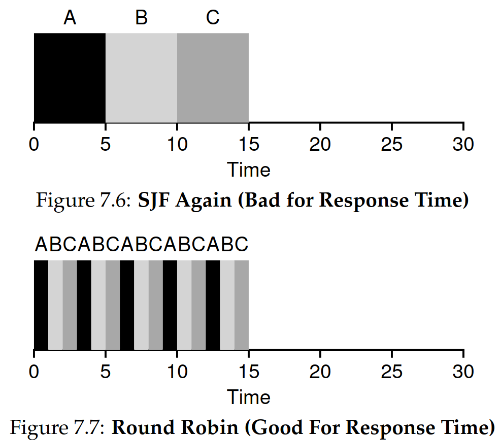 위의 그림은 세 프로세스 A, B, C 모두 0의 시각에 동시에 도착했고 각 프로세스의 CPU 사용 시간이 5로 동일하다는 가정에서 그린 그림입니다. 이 경우, SJF 정책을 사용할 때의 turnaround time은 (5 + 10 +15) / 3 = 10, response time은 (0 +5 +10) / 3 = 5입니다. RR 정책을 쓰고 timer 간격을 1로 설정하면, turnaround time은 (13 + 14 + 15) / 3 = 14, response time은 (0 + 1 + 2) / 3 = 1입니다. SJF 정책을 사용했을 때보다 turnaround time은 길어졌지만, response time은 짧아졌음을 확인할 수 있습니다. 이를 통해 RR 정책은 성능보다는 공정성에 중시한 정책임을 알 수 있습니다.