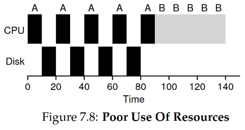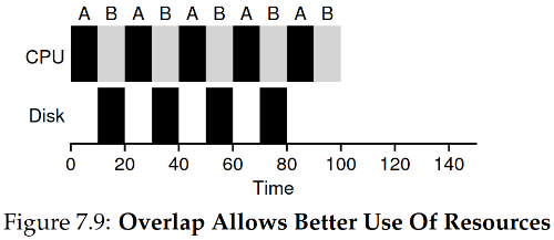 A가 먼저 scheduling 되면 위와 같은 그림으로 됩니다. 이때의 turnaround time은 (90 + 140) / 2 = 115, response time은 (0 + 90) / 2 = 45가 됩니다. 이때의 가장 큰 문제는 I/O 관련 일을 하는 동안 CPU가 놀고 있다는 점입니다. 이를 해결하기 위해 아래의 그림과 같이 overlap 하는 방법이 있습니다.