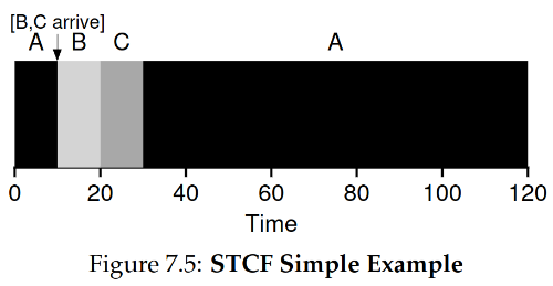 이러한 상황의 해결책으로 나온 정책입니다. 이 정책은 완료까지 짧게 걸릴 프로세스를 먼저 scheduling 하는 정책입니다. 이렇게 말로만 설명하면 SJF와 차이점을 딱히 못 느낄 수도 있습니다. 그러니 위의 문제 상황에서 STCF 정책을 적용해 봅시다.