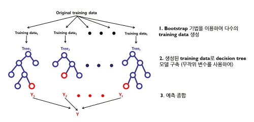 - 배깅(bagging: bootstrap aggregating): 수많은 부트스트랩 데이터를 생성해 이에 각각 독립적인 학습기를 여러 개 만들어 병렬로 학습(ex. 랜덤 포레스트)