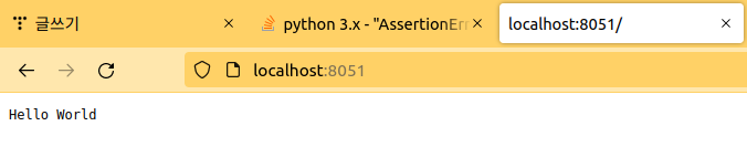 그럼 이 코드는 논리적으로 오류가 난 실패한 코드인가? 아니다. 위에서 좀 전에 설명했듯이 나는 간단한 '서버'를 구현한 것이다. 그러니 이를 확인하려면 Firefox나 Chrome 등의 인터넷 브라우저 창에서 'localhost:8051'에 접속해보자.