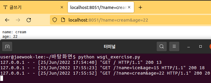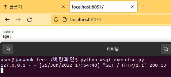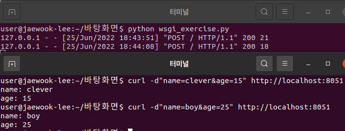 POST를 사용해보기 위해서는 두 개의 터미널만 필요하다. 브라우저 창은 필요 없다. 한 개는 WSGI 서버를 실행하고 다른 한 개로 POST 요청을 한다.