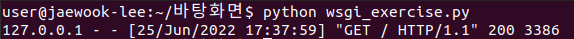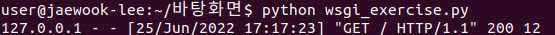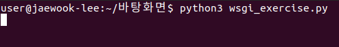 처음 알았다.. wsgi 프레임워크가 파이썬2 기반으로 만들어졌구나.. 파이썬 3에서 돌리려니 문제가 생겼구나! 예제 코드에서 파이썬 3에서만 돌아가는 코드는 없으므로 파이썬 2로 실행하니 정상적으로 작동되었다.