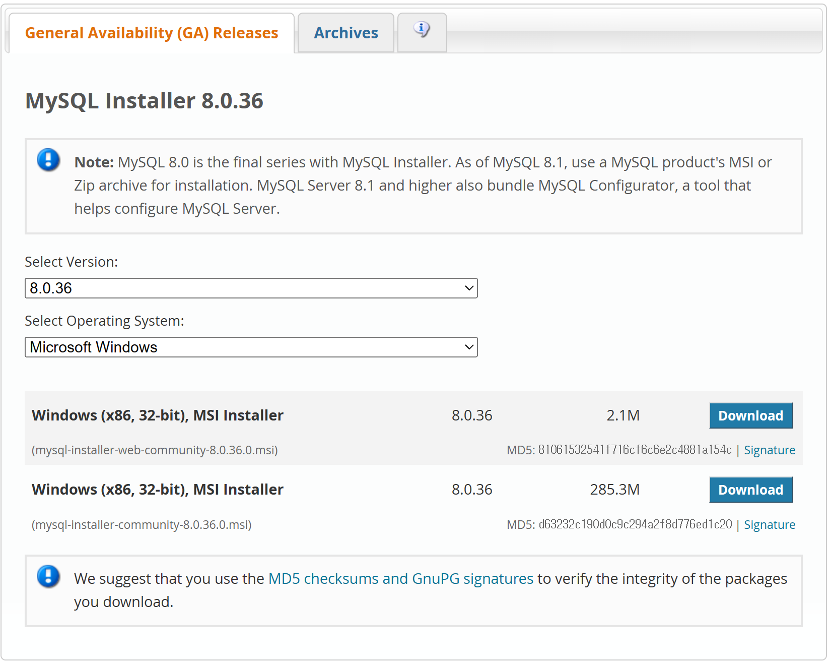 그다음 'MySQL Installer for Windows' 링크를 클릭합니다. 그러면 2가지 installer가 존재하는 것을 볼 수 있는데 여기서 아래의 installer(285.3M)를 다운로드합니다.