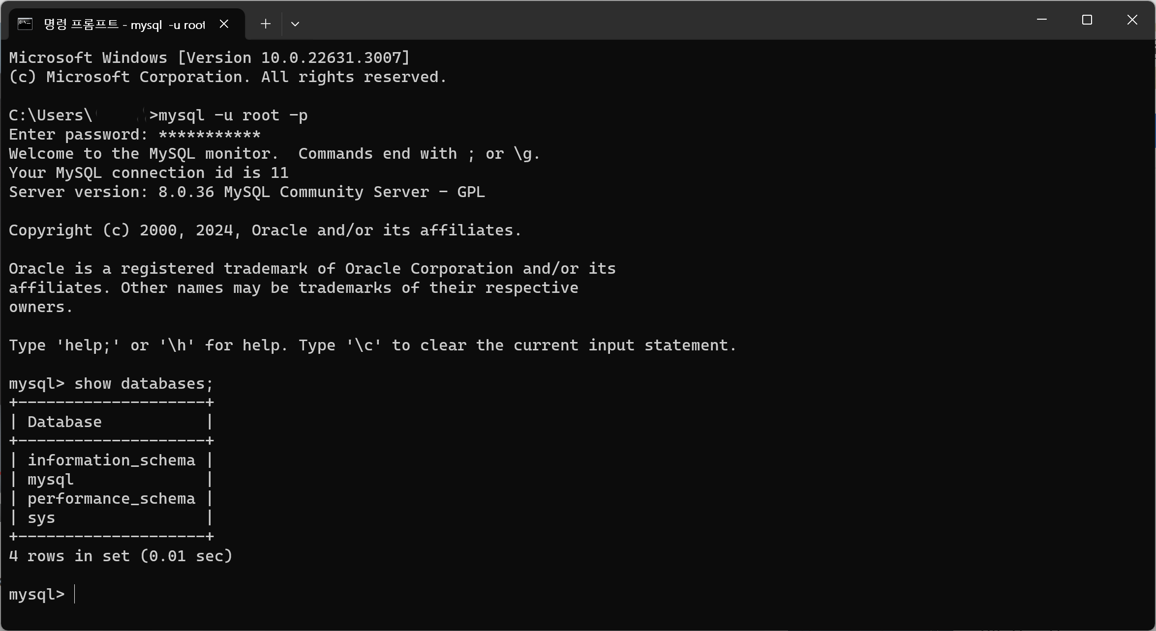 cmd 창에서 아래의 명령어를 입력하면 cmd 창에서 mysql server에 접속할 수 있습니다. 'exit' 명령어를 입력하면 나올 수 있습니다.