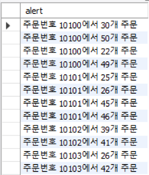 SELECT CONCAT('주문번호 ', orderNumber, '에서 ', quantityOrdered, '개 주문') AS alert