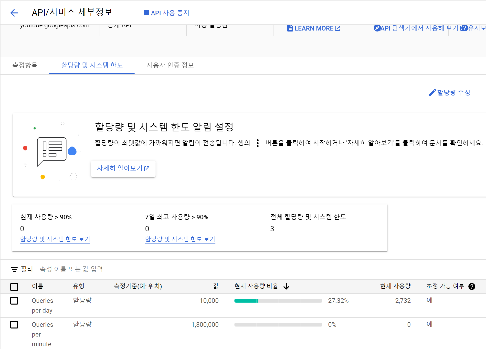 2024.02.10 - [K-POP 아이돌 SNS 분석] - 사전 과정 - instaloader 둘러보기 글에서와 같이 동영상의 좋아요 수나 댓글 수 등의 정보들을 얻기 위해서는 여러 단계를 거쳐야 하고, 각 단계별로 사용하는 API에 대응되는 사용량 단위의 요청이 이루어집니다. 따라서 할당량에 주의하며 사용해야 합니다.