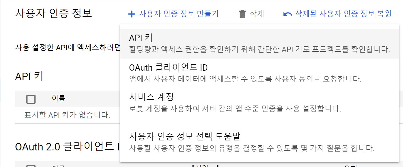 다음에는 프로젝트의 '사용자 인증 정보' 탭으로 가서 API 키를 받습니다.