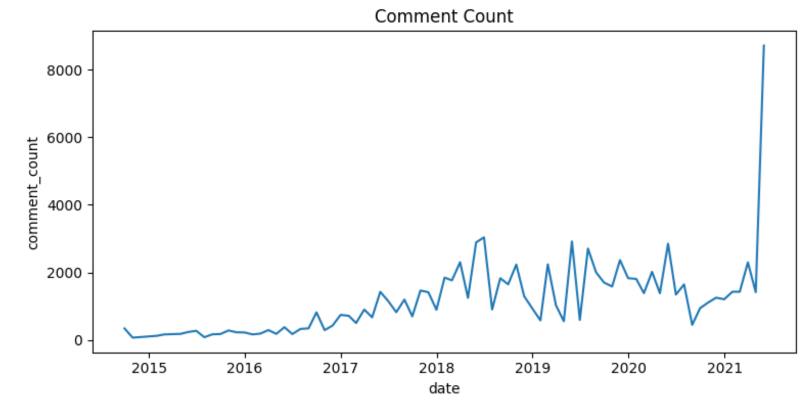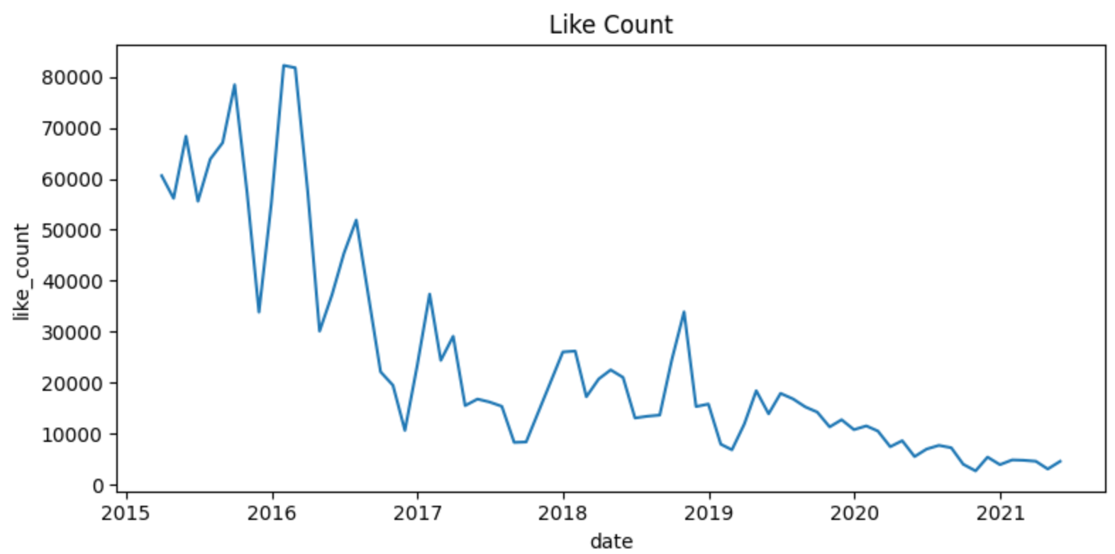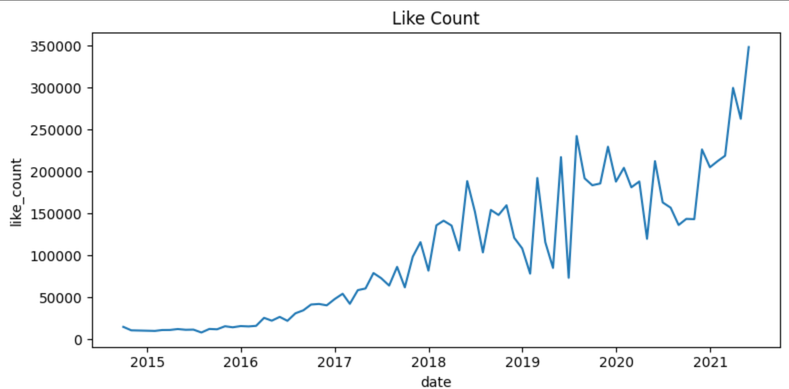 월 별로 좋아요 수와 댓글 수의 평균을 계산해서 시간에 따른 변화를 확인한 결과가 위의 두 그림과 같습니다.