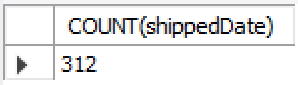 왼쪽의 결과를 보면 orders 테이블의 전체 행의 수가 326개임을 알 수 있습니다. 오른쪽 결과를 통해 shippedDate 열의 값이 NULL이 아닌 행의 수는 312개로 일부 데이터에 NULL 값이 있음을 알 수 있습니다.
