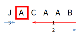 세 번째는 마지막 글자 "B"부터 왼쪽에서 첫 번째로 마주치는 "A" 문자열의 오른쪽 글자 "C"까지 "B", "A", "A", "C" 순서로 탐색하고 다시 "A", "A", "B"로 돌아간 다음 첫 번째 문자 "J"로 넘어가서 탐색하는 경우입니다.
