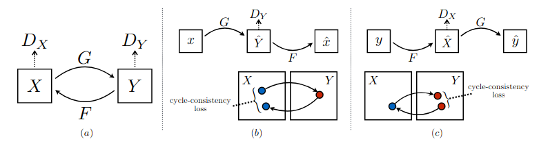 두 변환기 G, F를 각각 X 도메인에서 Y 도메인으로의 변환기, Y 도메인에서 X 도메인으로의 변환기라고 할 때,