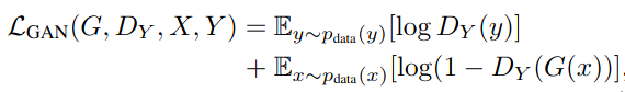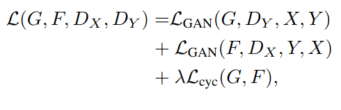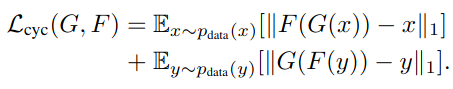 CycleGAN에서는 Pix2Pix와 달리 한 쌍으로 묶이지 않은 데이터셋에도 적용될 수 있습니다. 이러한 데이터셋을 사용하기 위해 cycle 손실을 사용합니다. 이에 사용되는 목적 함수는 아래와 같습니다.