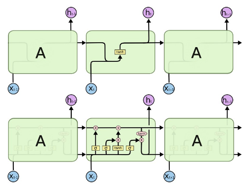 RNN 아키텍처를 사용하면 토큰 사이의 거리가 먼 경우에 연속적인 정보가 잘 전달되지 않을 수 있습니다. LSTM은 RNN과 달리 두 개의 상태 정보를 저장하고 처리합니다. 두 상태 정보를 각각 장기 기억(Cell State), 단기 기억(Hidden State)이라 부릅니다.