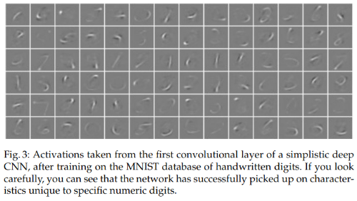 Convolutional layer는 CNN에서 중요한 역할을 담당합니다. 이 레이어의 파라미터들은 학습 가능한 kernel의 사용에 중점을 둡니다. 이 커널들은 작지만 입력의 depth 전체를 따라 퍼집니다. 데이터가 convolutional layer에 들어오면, layer안에서 각 filter는 입력 값을 슬라이딩하면서 convolution 연산을 해서 2D activation map을 생성합니다. convolution은 element-wise 곱셈한 결과들의 합을 구하는 과정입니다. activation map은 아래 그림(Fig. 3)처럼 시각화할 수 있습니다. 일반적으로 layer가 깊어질수록 사용되는 filter의 수가 많아지고 입력의 너비와 높이는 줄어듭니다. 이에 따라 깊은 layer에서는 고차원의 특징을, 얕은 layer에서는 저차원의 특징을 인식한다는 특징이 있습니다.