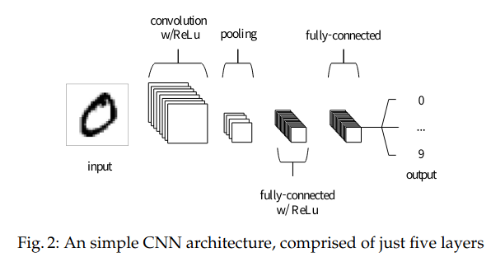 CNN은 세 가지의 layer(convolutional layers, pooling layers, fully-connected layers)로 구성되어 있습니다. MNIST 분류를 위한 간단한 CNN 아키텍처는 아래의 그림과 같습니다.