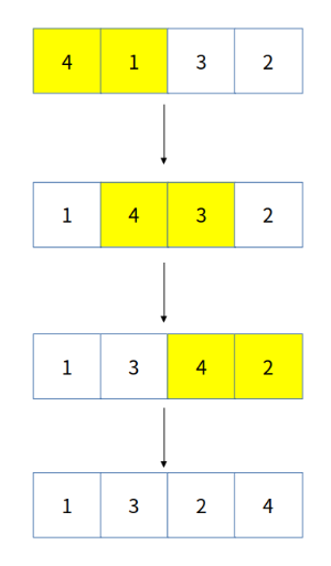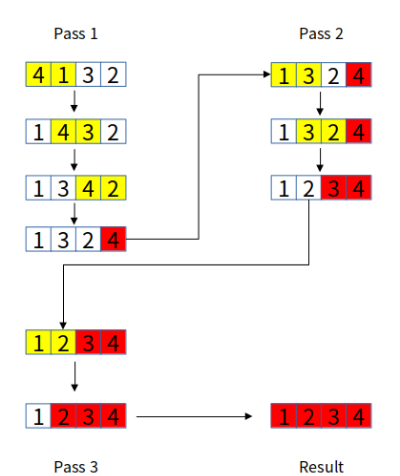 위처럼 첫 번째 pass가 끝나면 가장 큰 원소인 '4'가 배열의 끝에 위치하게 됩니다. 이와 같은 과정을 반복하면 아래처럼 정렬된 배열을 얻을 수 있습니다.