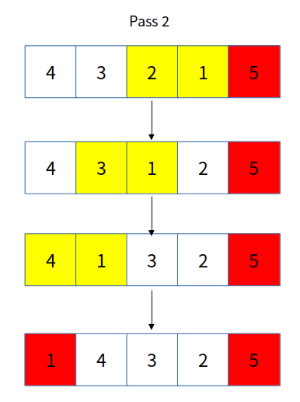 두 번째 pass는 작은 값을 왼쪽으로 보내는 방법으로 진행했습니다. 정렬된 맨 끝 값부터가 아니라 그 전의 값부터 인접한 두 값 간의 비교로 정렬이 이루어집니다. 두 번째 pass를 통해 기존 bubble sort보다 1의 값이 빠르게 제 자리를 찾았음을 볼 수 있습니다.