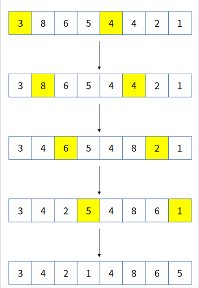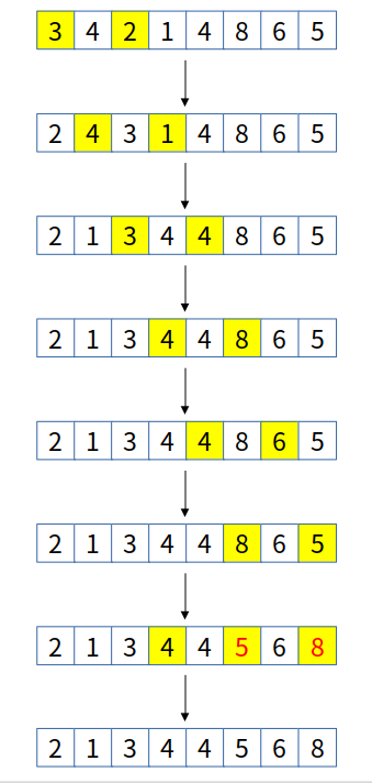 마지막에는 8과 5를 비교합니다. 5는 8보다 작으므로 5와 8의 위치를 바꿉니다. 그리고 5보다 2칸 앞의 원소와 다시 비교합니다. 4는 5보다 작으므로 더 이상의 swap은 발생하지 않습니다.