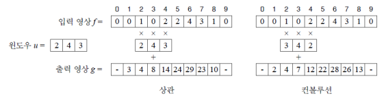 여기서 윈도우(필터)는 입력에 대해 특징을 알아내기 위해 사용하는 도구라고 생각하면 편합니다. 이 윈도우가 입력에 대해 슬라이딩하면서 연산을 진행합니다. 여기서 컨볼루션은 윈도우를 뒤집어서 연산을 진행합니다. 뒤집는 이유는 컨볼루션의 정의 때문인데 컨볼루션에 대한 설명은 위키피디아 설명을 참고하시길 바랍니다.