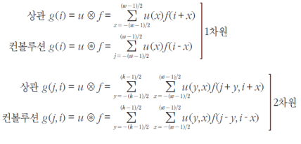 영역 연산에서 상관, convolution의 개념이 나옵니다. 상관과 convolution을 수식으로 표현하면 아래와 같습니다.