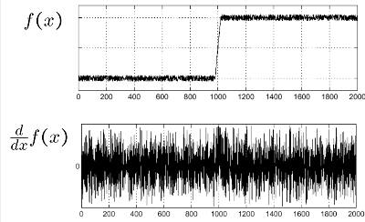 하지만 생각해볼 점이 있습니다. 만약, 이미지에 노이즈가 심하게 껴있다면? 노이즈가 껴있는 상황에서 바로 미분을 적용해 에지를 검출하기는 쉽지 않을 것입니다. 아래의 그림을 봅시다.