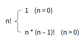 이 정의를 보면 n! 를 정의하는데 다시 (n - 1)!로 정의합니다. n > 0일 때 식을 풀어써봅시다.
