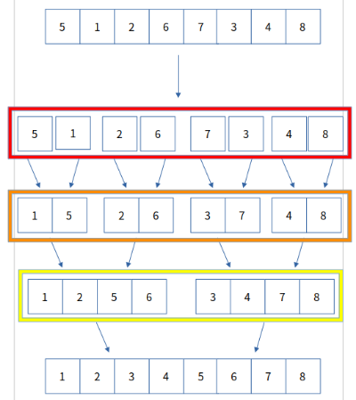 아래의 그림은 merge sort 과정에서 나누는 부분은 생략하고 그린 그림입니다.
