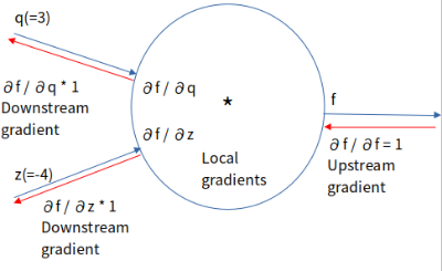 f = qz(q = (x + y)) 이므로 f를 q에 대해 미분하면 z만 남고, z에 대해 편미분 하면 q만 남습니다. 그래서 이 노드에서의 local gradients는 각각 ∂f / ∂q = z = -4, ∂f / ∂z = q = 3입니다. 따라서 흘러가는 downstream gradient들은 각각 ∂f / ∂q * 1 = -4, ∂f / ∂z * 1 = 3입니다.