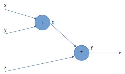 이 그래프는 f(x, y, z) = (x + y) * z를 나타낸 그래프입니다. 이 함수를 세 변수에 대해 편미분 한 값을 얻는 것이 목적입니다. 계산을 진행하기 전에 알아야 할 용어가 3가지 있습니다.