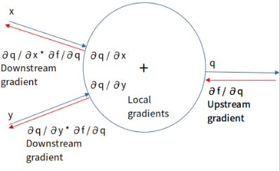 - Downstream gradient: Upstream gradient 값과 local gradient 값을 곱한 결과로 이 결과를 다음 노드로 반환합니다.