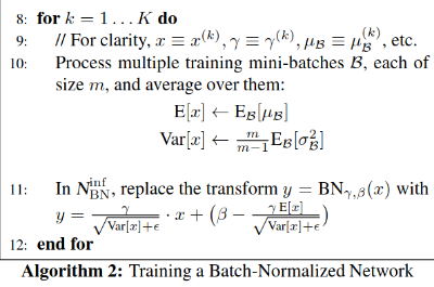 논문을 보면 평균은 미니 배치들의 평균들의 평균을 사용했고, 분산은 미니 배치들의 분산들의 평균값에다가 m / (m - 1) 값을 곱해줍니다.