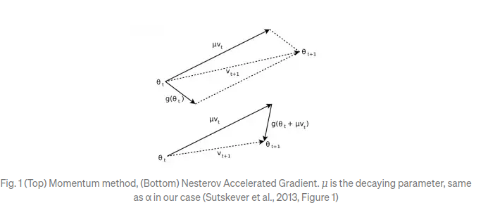 관성을 이용한 다른 경사 하강법으로 네스테로프 가속 경사도가 있습니다. 위에서 설명한 방법과 다른 방법으로 경사도가 갱신됩니다.