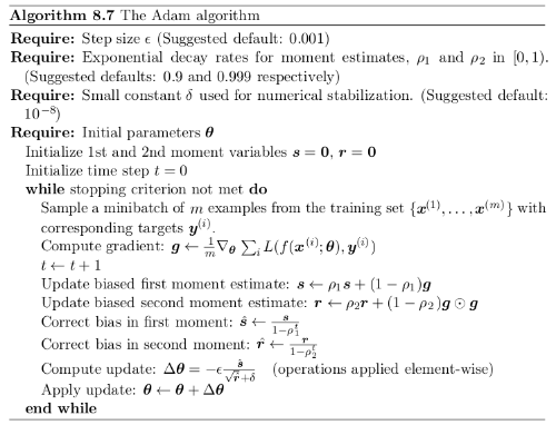 이 알고리즘에서 속도 벡터 v가 등장합니다. 속도 벡터는 그동안의 경사도를 누적한 것으로 초기에는 영벡터로 초기화한 상태로 시작됩니다. 그리고 momentum parameter는 관성을 얼마나 부여할지 결정하는 파라미터입니다. 0이면 관성이 아예 없게 되므로 기존의 경사도 갱신하는 방법과 동일하게 됩니다. 1에 가까워질수록 이전 경사도 정보들에 큰 가중치를 주게 되므로 모델의 파라미터가 그리는 궤적이 매끄러워지게 됩니다.