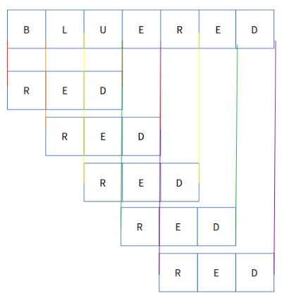 DFA로 들어가기 전에 왜 DFA를 써야 하는지 느끼기 위해 naive 하게 찾는 방법부터 보겠습니다. 예를 들어 문자열 "BLUERED"이 있고, 여기서 패턴 "RED"을 찾는 문제를 푼다고 합시다.
